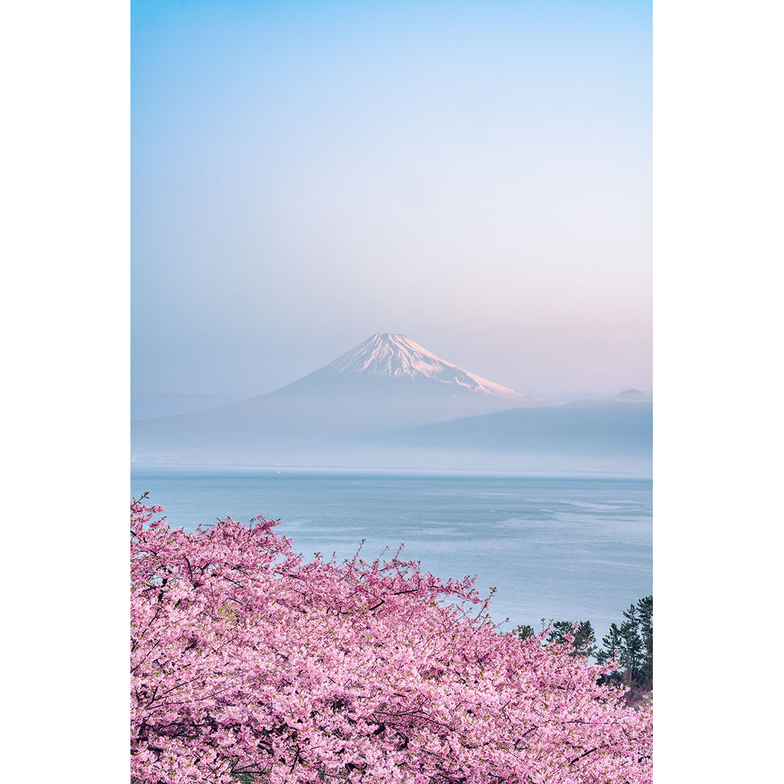 Just before the sun rises, there is a moment when the world seems to stand still. In the cold morning air, Mount Fuji stands majestically, surrounded by cherry blossoms in full bloom. The silence and tranquility before dawn, the hope that shifts towards morning—all affirmed by the powerful Mount Fuji standing in the center. It gives the viewer a quiet strength, a refined, meditative concentration and peace, and hope.