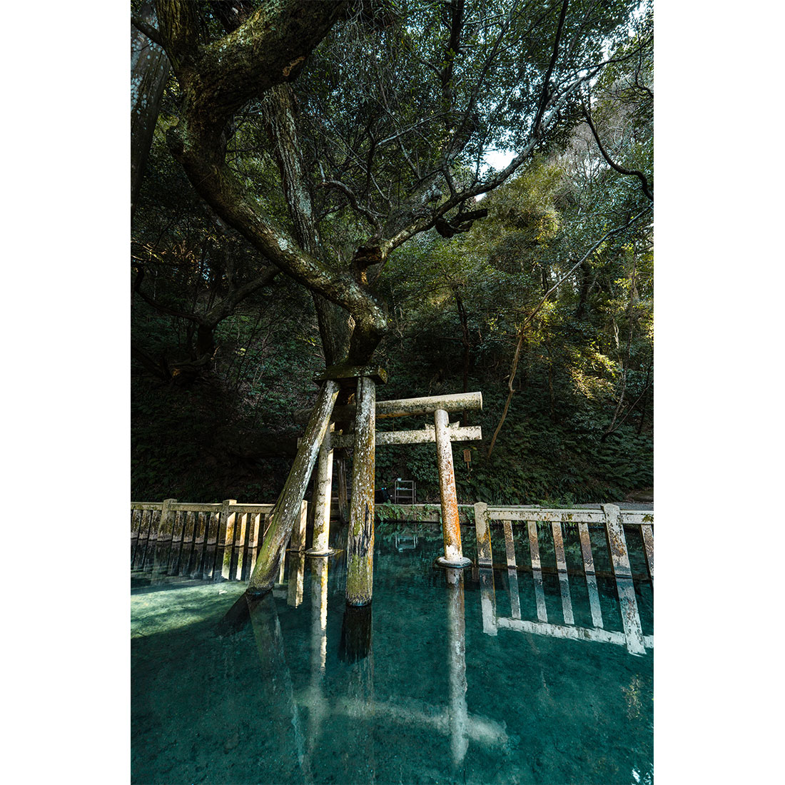 This contrast embodies purification and regeneration, reflecting the image of a sacred space (water torii gate) where life constantly circulates and is cleansed.